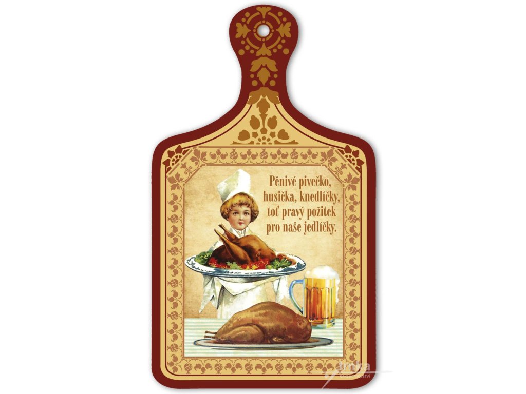 Vtipné starosvětsky laděné originální koláže Kláry Trnkové jsou doplněny nápisy ze starých vyšívaných kuchařek nebo reklam a natištěny na dřevěná prkénka. Jsou opatřeny očkem a slouží jako závěsná dekorace do kuchyně nebo jídelny.