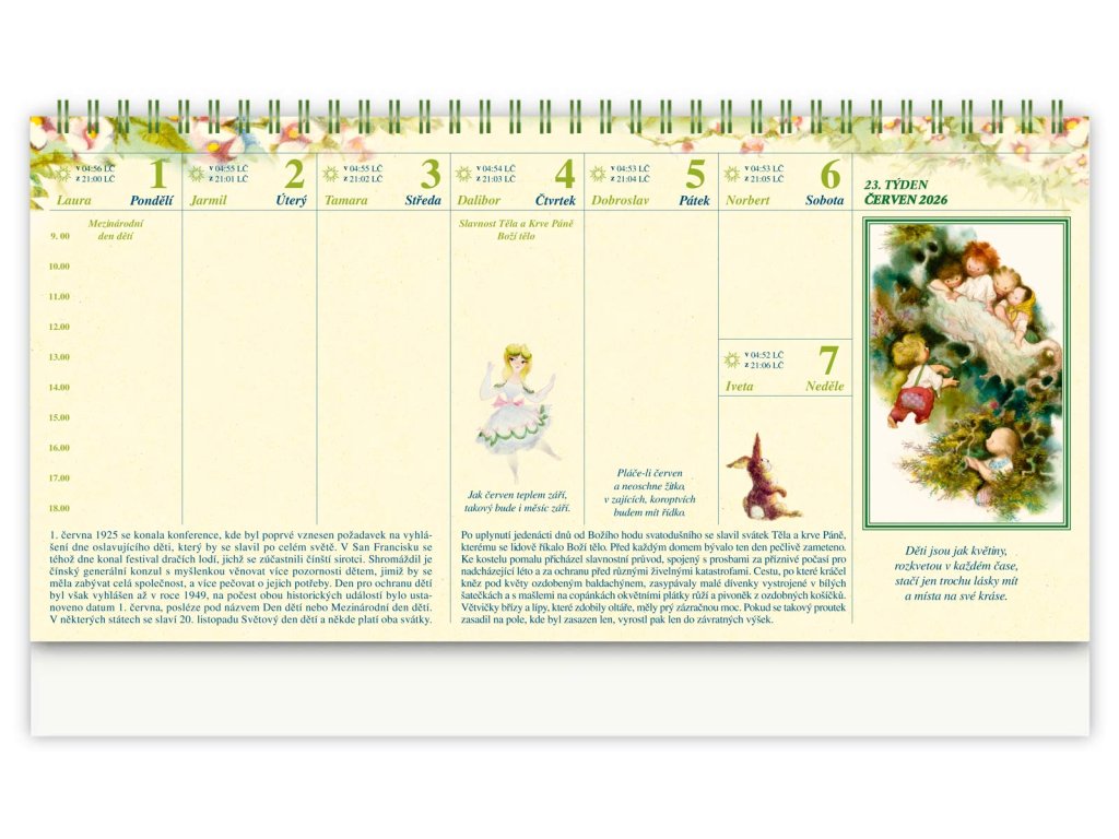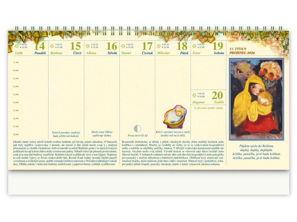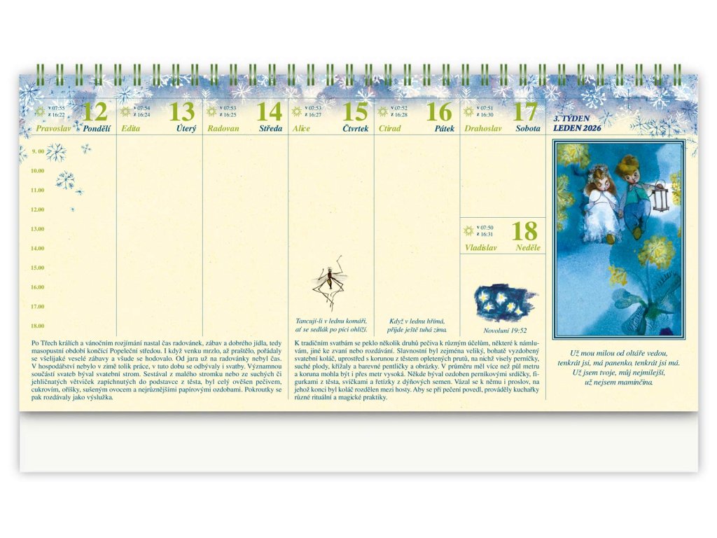 - Každý týden přináší nejen praktický přehled dní, svátků, východů slunce, ale i dostatku prostoru pro vaše zapisování.